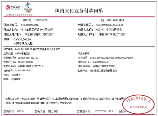 8月4日,向南京市江宁区慈善总会定向捐赠抗疫善款2万元。