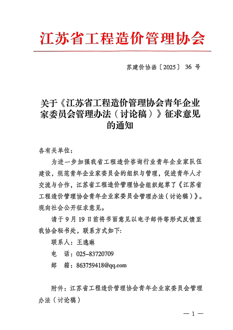 1、附件:关于《江苏省工程造价管理协会青年企业家委员会管理办法(讨论稿)》征求意见的通知.pdf【下载】