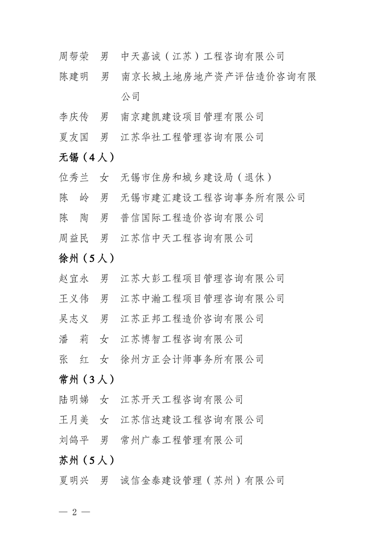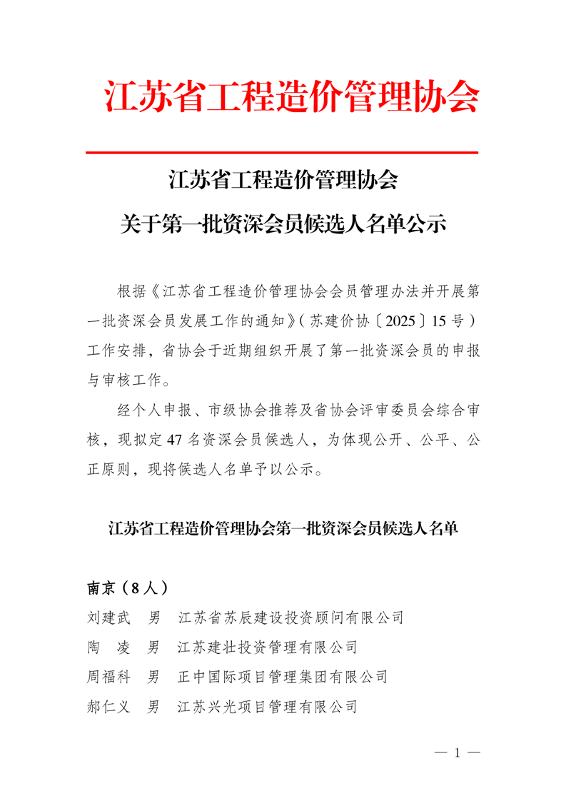 江苏省工程造价管理协会 关于第一批资深会员候选人名单公示