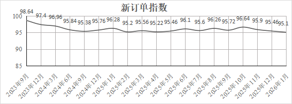 从构成行业景气指数的2个分类指数看,新订单指数为95.10,环比下跌0.36,该指数达到了自监测实施以来的最低点,表明市场需求持续呈现缩减趋势;从业人员指数为99.26,环比下跌0.02,表明企业从业人数有所下降。