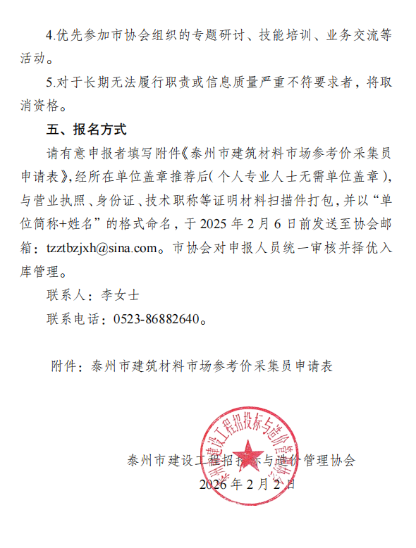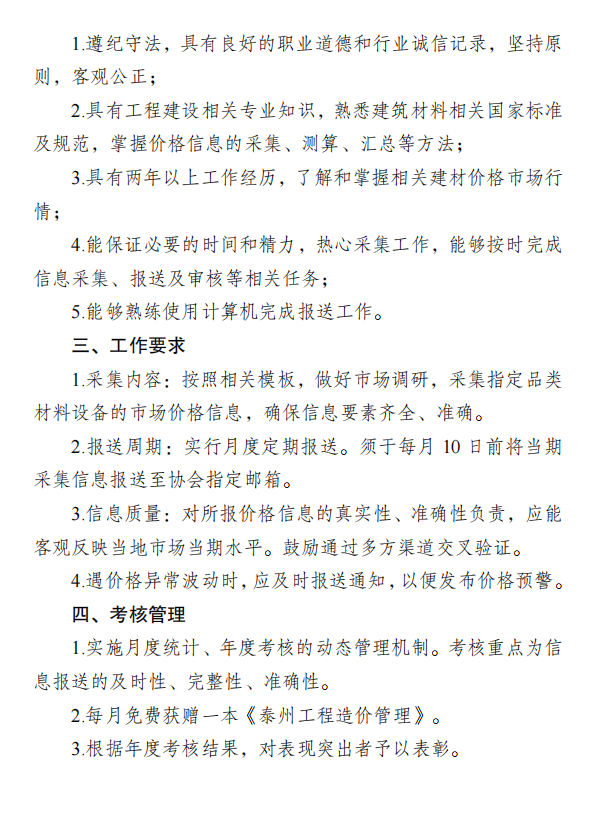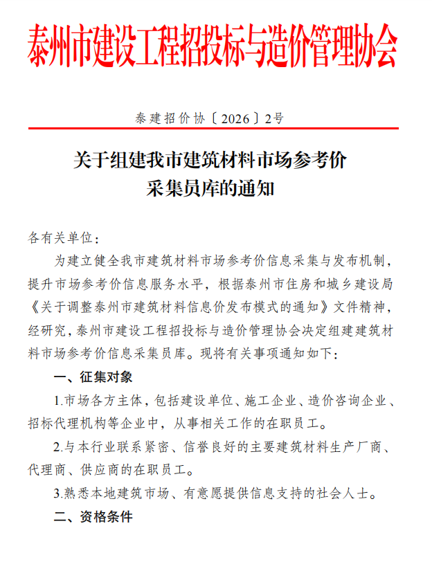 日前,泰州市建设工程招投标与造价管理协会根据市住建局关于调整材料信息价发布模式的文件精神,发文在全市组建建筑材料市场参考价采集员库,为协会下一步发布材料参考价奠定基础。